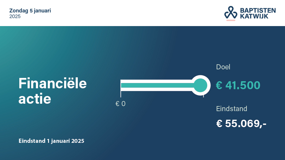 Wat een zegen om het jaar 2025 op deze manier te beginnen! De eindstand van de financiële actie van onze Baptistengemeente Katwijk is een prachtige €55.069,-. Hiermee is het doelbedrag van €41.000,- ruimschoots behaald. We zijn God enorm dankbaar dat Hij zo overvloedig heeft voorzien en dat zoveel gemeenteleden bereid waren om gul te geven.