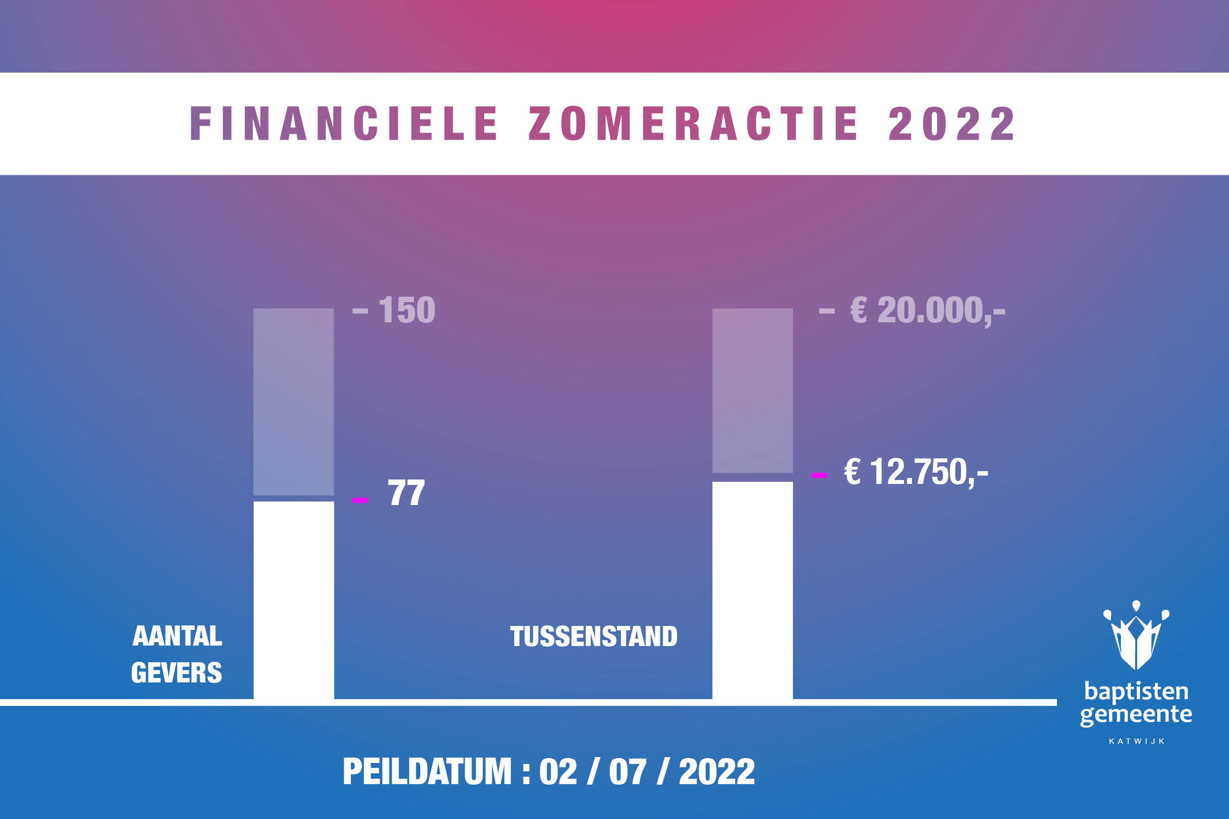 De Financiële zomeractie is nu ruim drie weken bezig. Op vrijdagavond 2 juli 2022 stond de teller Inmiddels op € 12.750. Dit bedrag is door zo’n 77 gevers bij elkaar gebracht. Het streefbedrag van de financiële actie – die loopt tot en met zondag 10 juli 2022 – ligt op € 20.000.