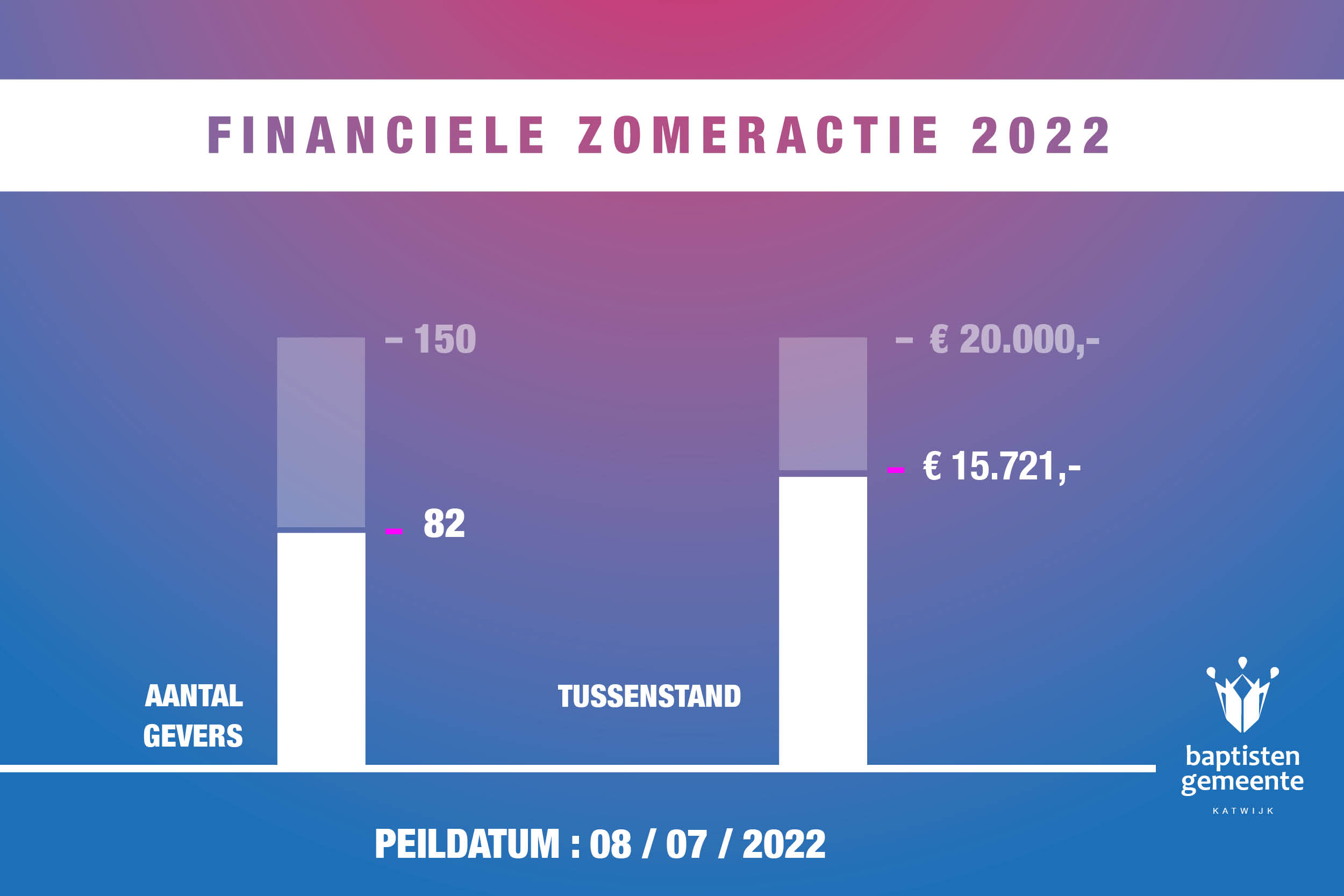 De Financiële zomeractie loopt bijna af. Tot en met zondag kunt u nog een bijdrage leveren. Inmiddels staat de teller op € 15.721,-. Dit bedrag is door zo’n 82 gevers uit de gemeente bij elkaar gebracht. Het streefbedrag van de financiële actie – die loopt tot en met zondag 10 juli 2022 – ligt op € 20.000.